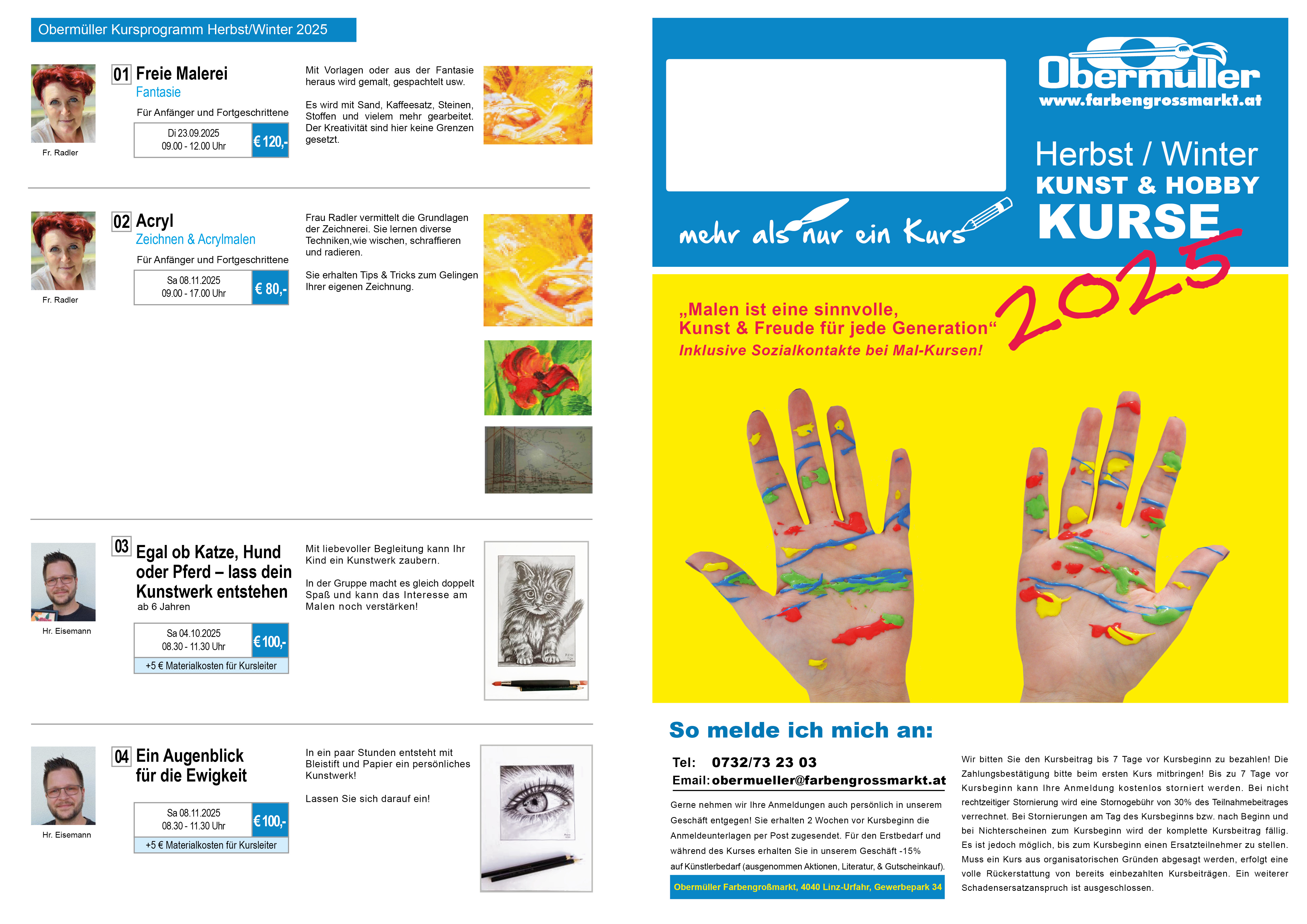 Gerne können Sie sich per E-Mail unter obermueller@farbengrossmarkt.at oder telefonisch unter 0732/ 73 23 03-11 zu einem unserer Kurse oder Seminare anmelden!